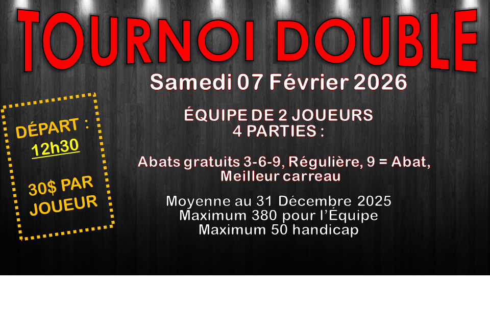 Accueil Nouvelles Tournoi Double Grosses Quilles Tournoi Double Grosses Quilles 23/09/2025 Sher-Mont Tournoi Double Grosses Quilles Le 07 Février 2026 inscription à l’accueil ou par téléphone. Catégorie(s) : N / C