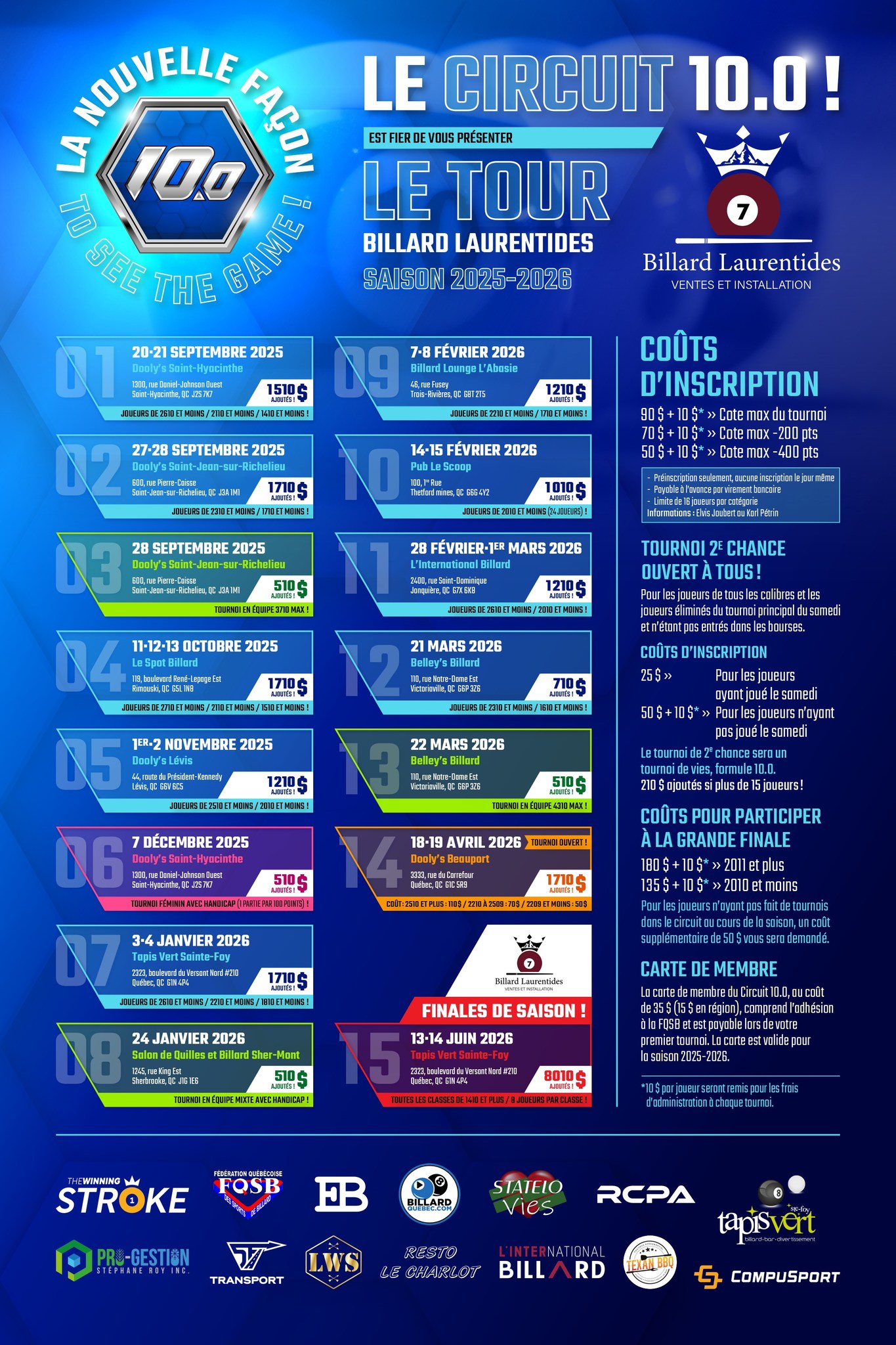 Accueil Nouvelles Tournois de Billard Tournois de Billard 23/09/2025 Sher-Mont Tournoi de billard du Circuit 10.0! qui aura lieu le 24 janvier 2026. Circuit 10.0 Catégorie(s) : N / C